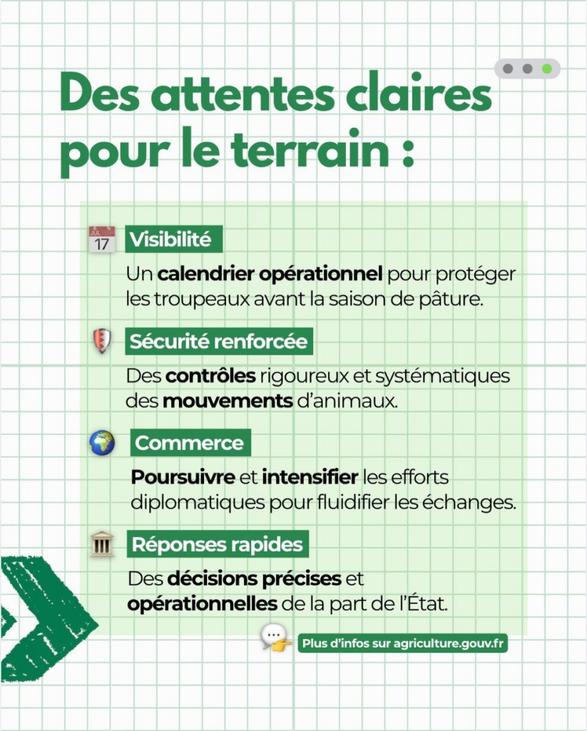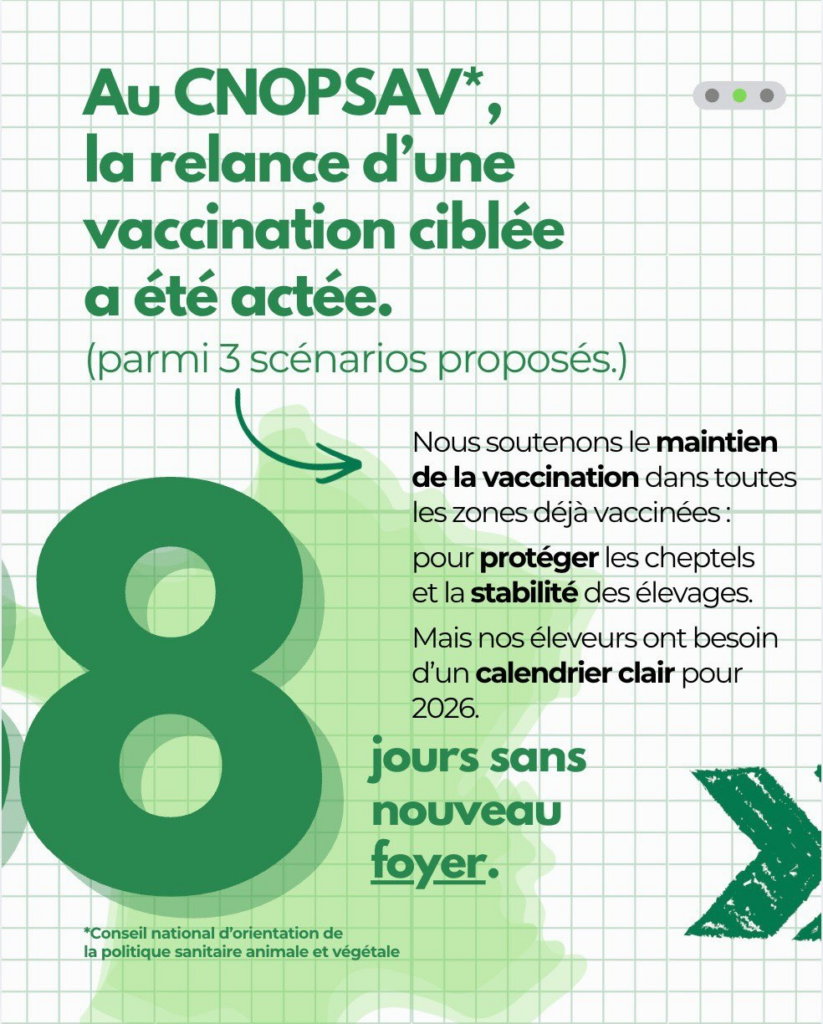 Lors du CNOPSAV du 9 février 2026, la ministre Annie Genevard a fait acter la relance d’une vaccination ciblée sur les zones ayant vacciné pour le maintien de l’immunité vaccinale. Aucun syndicat ne s’est prononcé en faveur de l’extension de la vaccination.