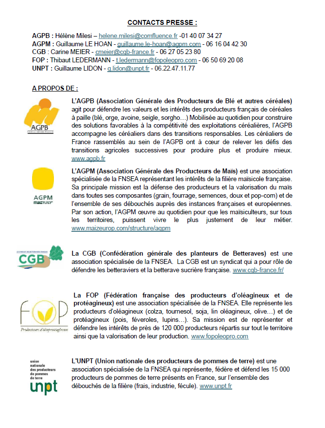 Face à ces annonces et alors que les premières lignes du projet de loi d’urgence agricole s’annoncent très loin de répondre à leurs besoins, les associations spécialisées tiennent à dénoncer les multiples déclarations et effets d’annonces des pouvoirs publics : « Ce qui se joue actuellement pour notre pays, c’est l’avenir de filières clés de notre agriculture : aux opérations de communication des ministères doit se substituer l’action immédiate : levée des taxes et surtout un véritable plan d’urgence à la hauteur des enjeux de production pour notre souveraineté et sécurité alimentaire »